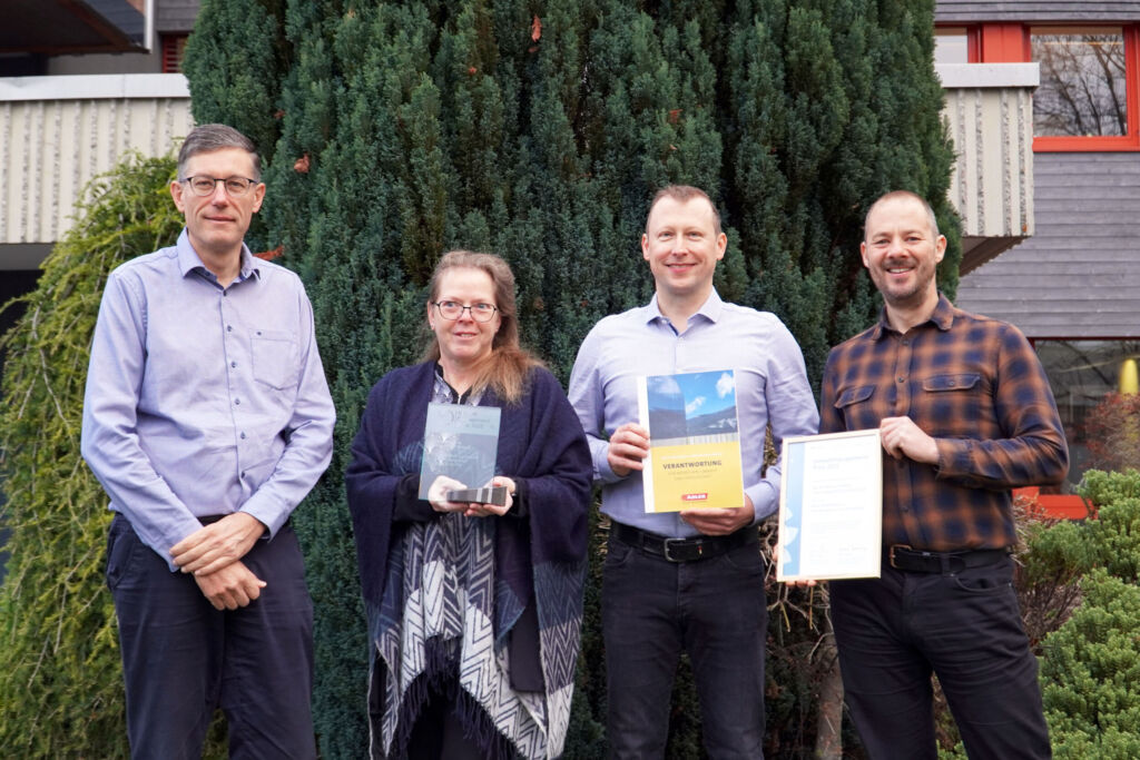 v.l.n.r.: Dr. Albert Rössler (Geschäftsleiter Forschung und Entwicklung), Bettina Delmonego und Wilfrid Jochum (Gestalter des Nachhaltigkeitsberichts) sowie Georg Hasibeder (Unternehmenskommunikation) – Bild: Adler-Deutschland GmbH