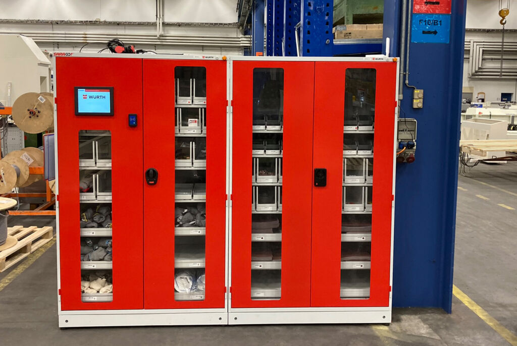Bei der Fertigung der Maschinen und Anlagen von Dornier wird neben klassischen Verbindungselementen und Kleinteilen eine Vielzahl von Werkzeugen und PSA benötigt. Das Portfolio umfasst mit über 350 verschiedenen Artikeln eine große Bandbreite und reicht von Cuttern, Schraubendrehern und Schutzbrillen bis hin zu Handschuhen, Gehörschutz und Masken. Bis vor zwei Jahren hat Dornier die Ausgabe dieser Produktgruppen über eine zentrale Ausgabestelle gesteuert. Dabei hat das Lagerpersonal das Material an die Mitarbeitenden vergeben, die Ausgabe erfasst und manuell für die Nachbestellungen gesorgt: eine Prozesskette, die viele manuelle Tätigkeiten für den Einkauf und das Lager und lange Wegezeiten für die Montage bedeutet, eine unnötige Lagerung von Materialien bedingt und Zeit bindet. Zudem sind die Mitarbeitenden an den Standort und die Öffnungszeiten der Materialausgabe gebunden. Genau an diesem Punkt setzen die Automatenlösungen von Würth Industrie Service bei Dornier an.