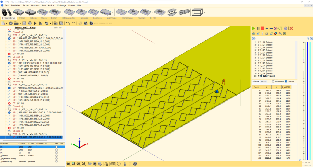 Einen halben Meter Gipskarton wird kaum jemand einlagern, genauso ist es oft mit OSB-Verschnitt. Aber vorher in Länge und Breite definierte Reststücke können formatiert und wieder eingelagert und im nächsten Lauf priorisiert berücksichtigt werden. Wir können auch automatische Lagerung, also Ein- und Austransport, mit Robotern oder automatischen Lagersystemen unterstützen. Größere Restteile, die nicht wieder eingelagert werden sollen, sind oft unhandlich und nur unergonomisch durch den Mitarbeiter abzunehmen bzw. in den Hacker zu werfen. In vielen Betrieben liegt eine Handkreissäge neben der Maschine, um unhandliche Teile passend für den Hacker zu durchtrennen. Aus Sicherheitssicht ist es nicht optimal, wenn der Bediener zwischendurch zur Handkreissäge greifen muss. Solche Zusatztätigkeiten sind für Unfälle prädestiniert. Wir können die Teile aber bereits im Nesting so vorschneiden, dass sie komfortabel abgenommen werden können und Dimensionen haben, die der Hacker ohne Probleme verarbeiten kann. Kleinteile, also Teile, die nur sehr schwer gesaugt werden können, können wir automatisch als erste bearbeiten, wenn das Vakuum noch besonders stark ist. Ebenso können sie mit sogenannten Stegen versehen werden, um zu verhindern, dass sie von der Absaugung angesogen werden. Zu guter Letzt können kleine Restteile – wie z.B. die typischen Kreuze die beim Schachteln verrundeter Teile entstehen – große Probleme mit der Absaugung verursachen, da sie angesaugt werden und sich dann im Schlauch verkanten. Um dies zu vermeiden, kann in BetterNest eine Prüfung der Rest-Geometrien erfolgen und solche Teile voll zerspannt werden.