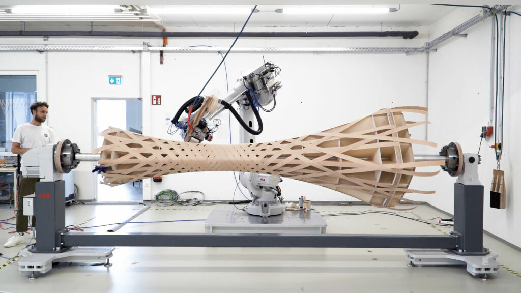 Die Baubranche ist im Umbruch. Gefragt sind neue Lösungen, die nachhaltiges, preiswertes Bauen erlauben. Holz spielt hier als nachwachsender Rohstoff eine wichtige Rolle. Teurer Baugrund bedingt jedoch aufgestockte Gebäude – eine Herausforderung für die Statik, die ihr mit Leichtbauverfahren begegnet. Im Rahmen des Forschungsprojekts 3DWoodWind hat Prof. Philipp Eversmann dafür an der Universität Kassel zusammen mit wissenschaftlichen Mitarbeitern und Studenten ein dreidimensionales Verfahren entwickelt. In ihm werden Deckenelemente und Stützpfeiler mit bis zu 1m Durchmesser und 3,5m Länge aus gewickeltem Furnier hergestellt. Sie werden computergesteuert mithilfe von Robotern gefertigt und wiegen weitaus weniger als Vollholz- oder Betonkonstruktionen. Mit geringem Materialeinsatz gelingen so Hohlbauteile mit hohem Tragverhalten. Für Entwicklung und Fertigung kommen Roboter von ABB zum Einsatz. Weil diese Roboter atypisch eingesetzt werden, hat der Lehrstuhl eigene Tools und Softwares erdacht.