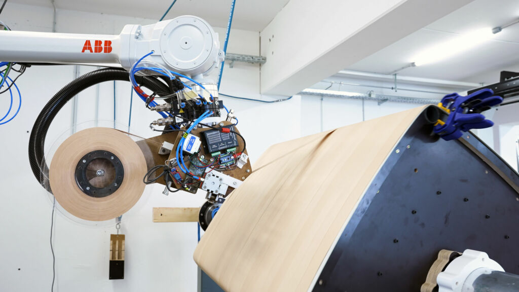 Die Anlage wurde für den Einsatz über eine Absolut-Vermessung von einem ABB-Techniker optimiert. Hier zeigte sich, dass die Anforderungen an die Robotersteuerung höher sind als in der herkömmlichen industriellen Produktion. Zu Beginn des Projekts kamen zwei IRB 1200-Industrieroboter zum Einsatz, mit deren Hilfe Modelle produziert wurden. Die Entwicklungen und Erfahrungen wurden später auf die große Anlage mit zwei IRB 4600 übertragen. Er zeichnet sich durch eine geringe Störfläche und einen kleinen Störradius aus, weshalb er sich nah am Werkstück platzieren lässt und eine Reichweite von bis zu 2,55m besitzt. Hinzu kommt ein IRBP L-Werkstückpositionierer mit Rotationsachse, der die Form hält, auf die der IRB 4600 Holzbänder anbringt. Der Positionierer gleicht automatisch die Auswirkungen von Schwerkraft, Trägheit und Reibung aus. Die eingebaute Load Identification berechnet sowohl Schwerpunkt als auch Trägheit des Werkstücks und der Spannvorrichtung. Für den Klebstoffauftrag hat die Uni Kassel zusammen mit Oest und Jowat einen Endeffektor mit Pumpsystem entwickelt. Er kann das Furnierband aus Buchenholz, das auf 200-Meter-Rollen angeliefert wird, zugleich extrudieren, beleimen und automatisiert zuschneiden. Über zwei integrierte Druckfedern im Endeffektor lässt sich eine definierte Zugkraft auf das Furnierband einstellen. Das gewährleistet einen ausreichenden Anpressdruck für die Verklebung im Wickelprozess. Eine nachträgliche Verpressung über Schalungen oder Vakuumsäcke ist nicht notwendig. „In Zukunft wollen wir diese Steuerung für die Produktion von nachhaltigen Fassadenprofilen weiterentwickeln, bei der aktuell fast immer Aluminium verwendet wird, was einen großen CO2-Fußabdruck hinterlässt“, so Eversmann.