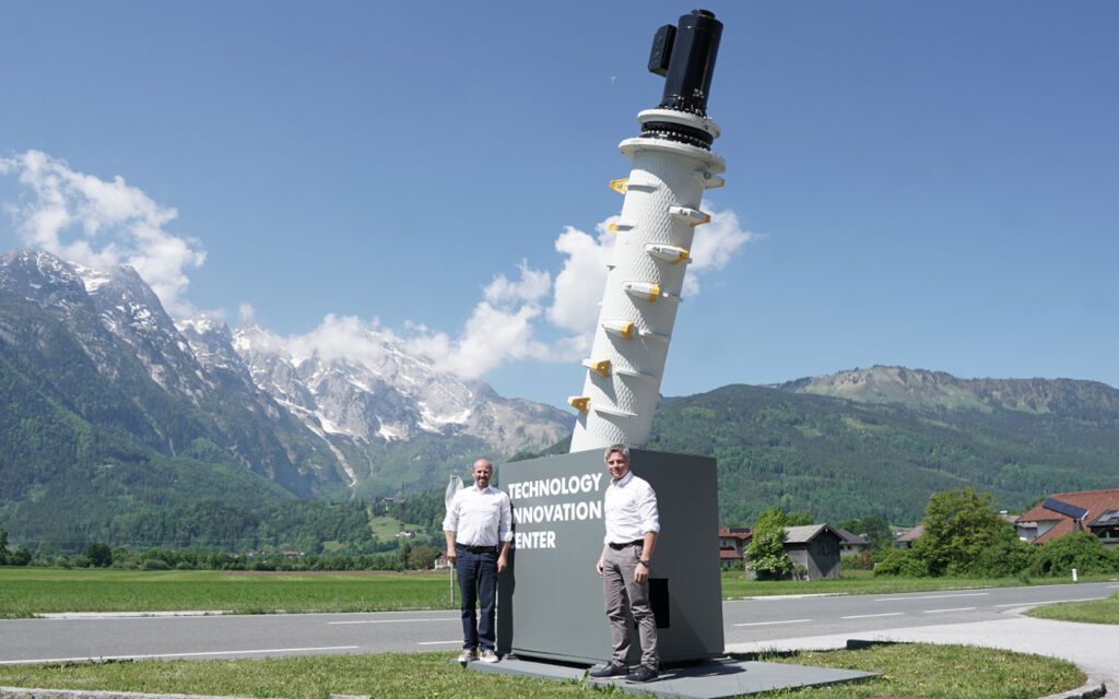 Christian Lanner und Stefan Scheiflinger-Ehrenwerth mit dem ca. 6m hohen Wahrzeichen des TIC: einem zu einer Skulptur umgewandelten XR-Rotor. – Bild: Untha Shredding Technology GmbH