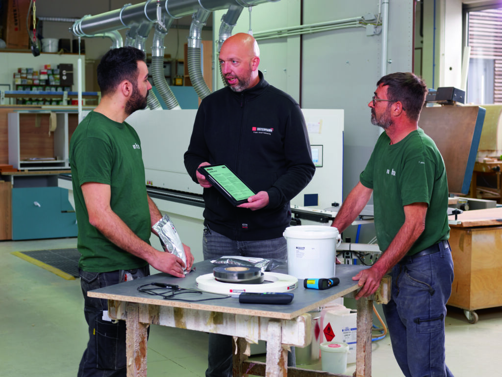 Es folgten verschiedene Durchläufe mit der transparenten Ostermann-Testkante. Ziel dabei war es, die perfekte Einstellung für den Klebstoffauftrag und eine möglichst dünne Fuge zu ermitteln. Nach einigen manuellen Anpassungen im Maschinenmenü stimmte das Ergebnis hinsichtlich Klebstoffmenge und -auftrag schließlich zufrieden. So hielt Geschäftsführer Norbert Kaumanns eine weiße Platte mit einer weißen Kante in der Hand, deren Fugenqualität alle Anwesenden überzeugte – der erfolgreiche Abschluss des ersten Teils der Umstellung. Das leitete den Reinigungsprozess ein. „Wir waren erstaunt, wie einfach die Umstellung auf PUR, aber auch die anschließende Reinigung ist“, staunt Tischlergeselle Deniz Güglüoglu. „Eigentlich gibt es nur zwei, drei wichtige Punkte zu beachten, um noch mal eine deutlich bessere Fugenqualität zu erhalten.“