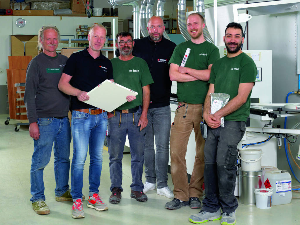 Form. Funktion. Fertigung. Unter diesem Motto plant und baut die Tischlerei In Holz aus Mönchengladbach nicht nur individuelle Möbel und Einbaulösungen für Privat- und Firmenkunden und Architekturbüros. Sie fertigt auf der 5-Achs-CNC auch Serienformteile nach Kundenwunsch, unter anderem für den KFZ-Innenausbau. Sieben Mitarbeiter greifen die Impulse ihrer Auftraggeber auf und fertigen hochwertige Möbel, die nicht nur gut aussehen, sondern auch funktional sind. „Zu unseren Anforderungen zählt natürlich die Qualität bei der Kantenverarbeitung“, sagt Geschäftsführer Peter Schneider. „Deshalb haben wir vor einiger Zeit eine neue Kantenanleimmaschine angeschafft. Um noch dünnere, wasser- und wärmestandfestere Fugen zu erhalten, wollten wir die Kanten danach mit PUR-Schmelzkleber anfahren.“