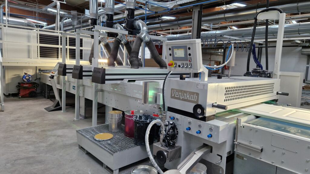 Drei Schleifmaschinen für den Vor- und Lackzwischenschliff, vier Walzlackiermaschinen für die Grundierung: Bei Plüm ist im Lackier- und Grundierungsprozess nun einiges im Einsatz. Hinzu kommt eine fünfte Walzlackiermaschine als Ersatz. Wenden und Rückführung der Werkstücke für einen zweiten Durchlauf eingeschlossen, umfasst der gesamte Vorgang 14 Schritte. Die neue Anlagenkombination spart 50% mehr Zeit gegenüber der Beschichtung auf zwei separaten Lackieranlagen. Neben der Walz- und Spritzlackier-Anlage inklusive Trocknungstechnik stammt auch die gesamte Förder- und Lufttechnik von Venjakob.
