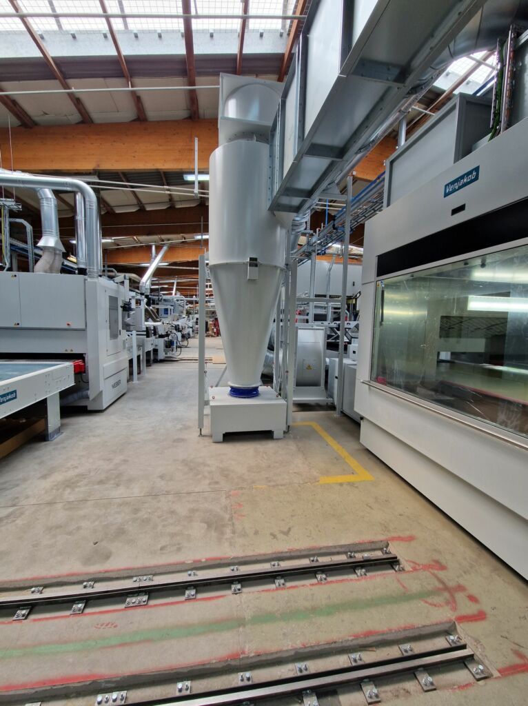 Eine gute Lackierung, wie sie für Innenraumtüren gebraucht wird, sieht ansprechend aus und ist widerstandsfähig. Von diesem Weißlack soll natürlich möglichst viel auf der Tür ankommen. Dafür gilt der Einsatz einer Walzmaschine als ideal, denn hier trifft der Lack zu 100% auf die Tür – kein Verlust durch Sprühnebel, wie es beim Spritzlackieren passiert. Wobei Venjakob auch hier den nachfolgenden Prozess des Spritzlackierens so gestaltet hat, dass möglichst wenig Lack verloren geht. Zum einen reduziert die Luftkonditionierung der Spritzkabine die Vernebelung, wodurch mehr Lack auf die Tür übertragen wird. Zum anderen kommt eine eigens entwickelte Zyklonabscheidung zum Einsatz, die den Lackabfall sammelt und damit die Entsorgungskosten verringert.
