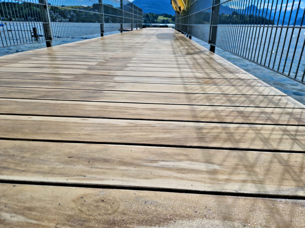 Das widerstandsfähige Material heißt Grip New Wood P5/R12, es zeichnet sich durch lange Standzeiten aus. Grip New Wood deckt dabei alle Besonderheiten im Hinblick auf das Material Holz ab. Durch seine wässrige Viskosität lassen sich auch große Flächen gut bearbeiten. Einsetzbar ist die transparente und wetterfeste Antirutschbeschichtung für alle Arten naturbelassener Hölzer vor allem im Außenbereich. Die körnige Zwei-Komponenten-Beschichtung ist umweltfreundlich, UV-beständig und besitzt die Sicherheitsklasse R12, das entspricht der DIN EN 16165.