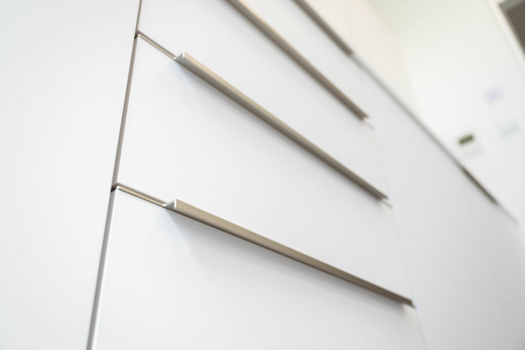 Das Herz von Team Oer schlägt für die speziellen Projekte. Solche, bei denen entweder besondere Entwurfsfinesse gefragt ist oder spezielle Anforderungen an die Möbel bestehen – oder im besten Fall beides. Üblicherweise bringen Arztpraxen und Apotheken all das mit. Denn hier geht es einerseits darum, optisch ansprechende Möbelstücke mit viel Stauraum zu kreieren, und andererseits müssen die Gewerke besonders robust sein und hohe hygienische Anforderungen erfüllen. „Die Möbel müssen desinfektionsmittelbeständig sein, teilweise auch antibakteriell, und eine stoßfeste Oberfläche ist für die Langlebigkeit der Einrichtung ebenfalls vorteilig“, sagt Oer. Dabei greift seine Tischlerei gerne auf innovative Materialien zurück. Materialien wie die Oberfläche Rauvisio noir von Rehau, die in einem Projekt in Oldenburg die vertikalen und horizontalen Flächen für alle rund 300 Schränke bildete. Die Architektin profitierte dabei von dem Materialwissen des Oer-Teams: „Wir kannten die Platte und wussten: Sie ist hochwertig, sie ist beständig, sie passt genau zu diesem Projekt.“ Dass sich die Tischlerei immer mit den neusten Materialien auseinandersetzt, hat ebenfalls Tradition: „Unser Vater ist schon immer mit uns auf jede Messe gefahren, damit wir wissen, was die neusten Beschläge und die neusten Materialien sind. Da kommst du z.B. auf den Stand von Rehau, siehst diese Oberfläche und denkst: Die ist super. Und für die Kunden ist dieses Wissen Gold wert, egal ob es Architekten sind oder Endkunden“, erklärt der Ingenieur für Innenausbau und Holztechnik. Die Architektin der Orthopädiepraxis ließ sich schnell mit einem Materialmuster überzeugen, und so wurden alle Funktionszeilen in ihrem schlichten Weiß mit Rauvisio noir gefertigt. „Dazu kamen noch die Spinde, die OP-Säle, die Aufwachräume, die Teeküchen – alles haben wir mit Rauvisio noir ausgestattet.“