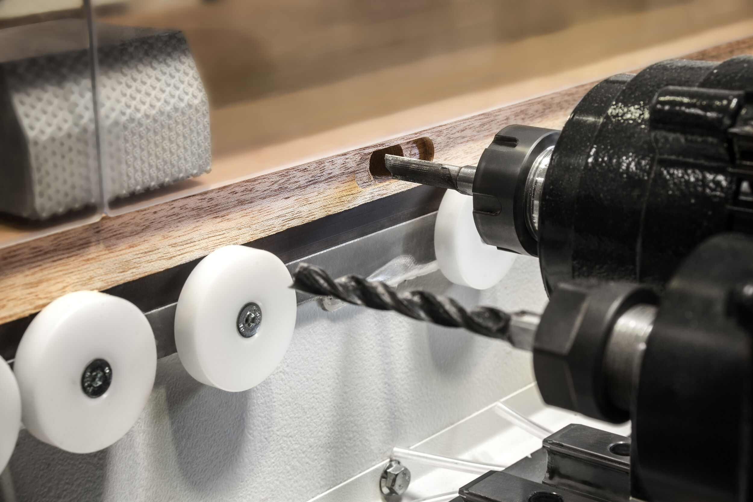 Für kleine Losgrößen liefert Koch einen anderen Ansatz: das einseitige Bearbeitungszentrum Sprint. Weil die Bearbeitungseinheiten variabel einstellbar sind, bietet sie Nutzern viele Möglichkeiten zur Bestückung – je nach Anforderung: Bohr- und Dübelbearbeitungen am Werkstückrand sind ebenso machbar wie Beschlagsetzen, horizontales sowie vertikales Fräsen und Nuten, aber auch die Bearbeitung unter 45 bzw. 90 Grad. Ausgelegt ist Sprint vor allem auf die Bearbeitung von Korpusmöbeln, Schubkästen, Rahmen- und Massivholzteilen. Auch dieses einseitige Bearbeitungszentrum ist kompakt. Beschicken lässt es sich sowohl manuell als auch robotisch.