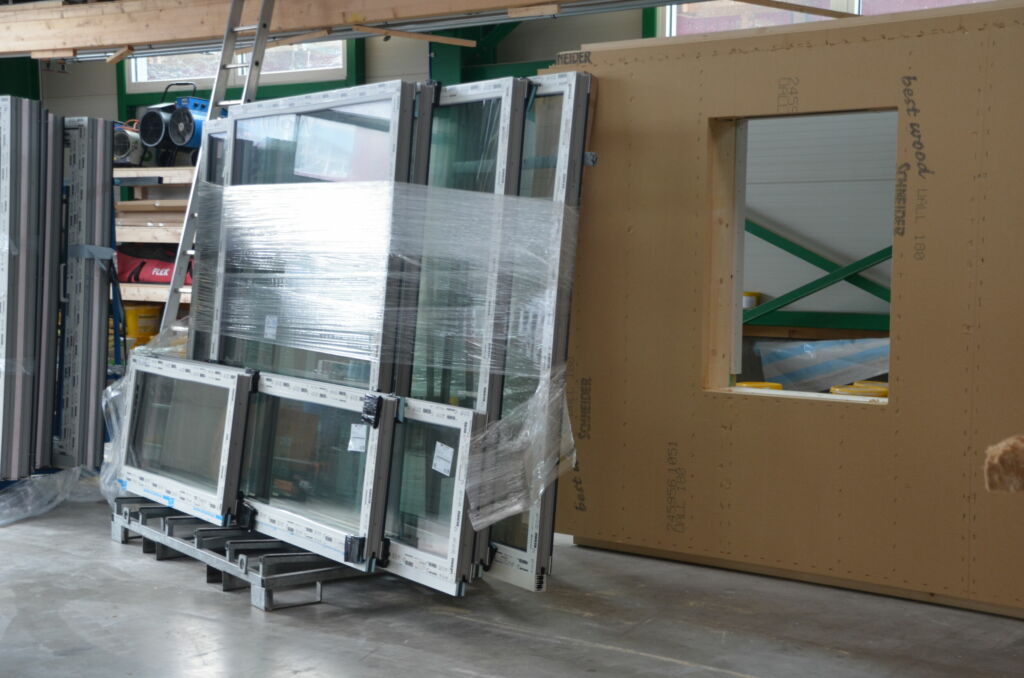 Auch Fensterinstallation spielt eine wichtige Rolle in der Produktion von Willi Mayer Holzbau. Deren Elemente werden stehend angeliefert und zunächst auf einen Lagerbock abgelegt, um sie für die Montage vorzubereiten. Anschließend muss das Team sie präzise in die vorgefertigten Wandelemente einsetzen. Hier beweisen die Vakuumheber ihr Können, die die schweren Fensterelemente aus den verschiedensten Lagen bewegen und es den Mitarbeitern ermöglichen, die Fenster genau zu positionieren. „Überzeugt hat uns, wie flexibel und beweglich die Heber sind“, betont Mayer. Dank der exklusiven MTC-Schutzüberzuge bleiben die empfindlichen Fensteroberflächen abdruckfrei. Die Leistungsfähigkeit der Vakuumheber ist besonders bei modernen Isolierverglasungen wichtig, denn sie sind wegen ihrer Mehrfachverglasung ausgesprochen schwer – aber auch deren Installation ist für das EuroTech-Produkt kein Problem.
