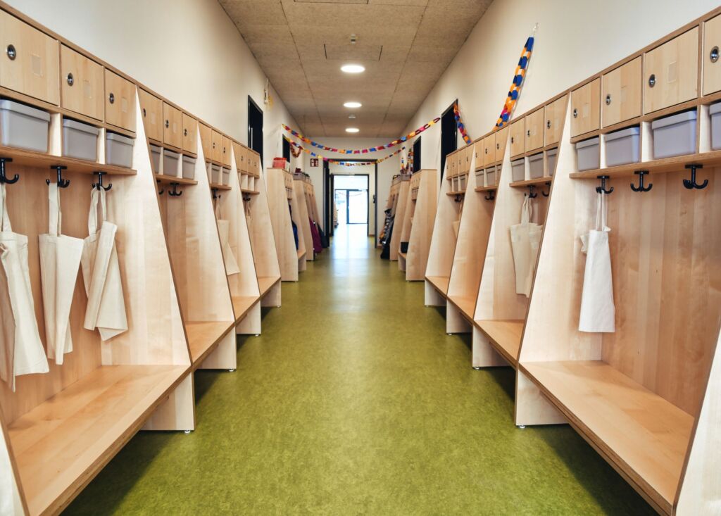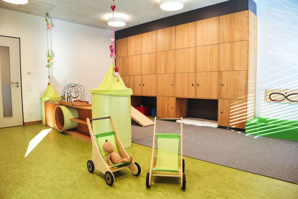 Jedes fünfte Gebäude in Deutschland ist inzwischen aus Holz. Nicht nur politisch ist diese Quote gewollt, ein wichtiger Schritt sind auch Baurichtlinien. Für Mod21 gehen darum die Vorhaben in der Region Reutlingen weiter – abermals vorgefertigt auf den Weinmann-Linien in Torun. Als Nächstes lässt die Stadt ein Kinder- und Familienzentrum bauen. Und auch im und bei Kleinen kommt der Holzbau gut an: 810 Quadratmeter fasst das Kinderhaus Wittum 1, verteilt auf zwei Etagen. Für die drei Gruppen verfügt die Einrichtung über einen Koch- und Essbereich, mehrere Gruppenräume, einen Bewegungsraum, barrierefreie Sanitärräume sowie Räume für das Personal. „Wir haben dem Bauherrn nicht nur ein langlebiges Gebäude geliefert“, sagt Zec. „Die Kinder verbringen ihre Tage auch in einem gesunden Raumklima.“
