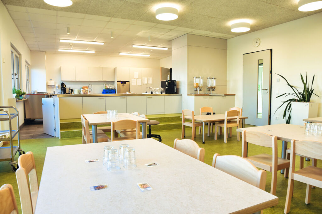 Dagegen besteht die Linie für Boden- und Deckenelemente aus einem Auflegetisch für die Riegelwerkerstellung, Schmetterlingswendetischen, einem weiteren Arbeitstisch sowie einer Multifunktionsbrücke. Sie kann Oben und Unten der Elemente bis zu 4,2 Metern Breite bearbeiten. Zuletzt nimmt ein Kran die Böden auf und bringt sie zur Modulline. Dort setzt er sie auf Wagen und nivelliert sie aus, damit die Module beim Zusammenbau im Lot stehen. Es folgt die Montage der Wand- und Deckenelemente.Koch- und Essbereich