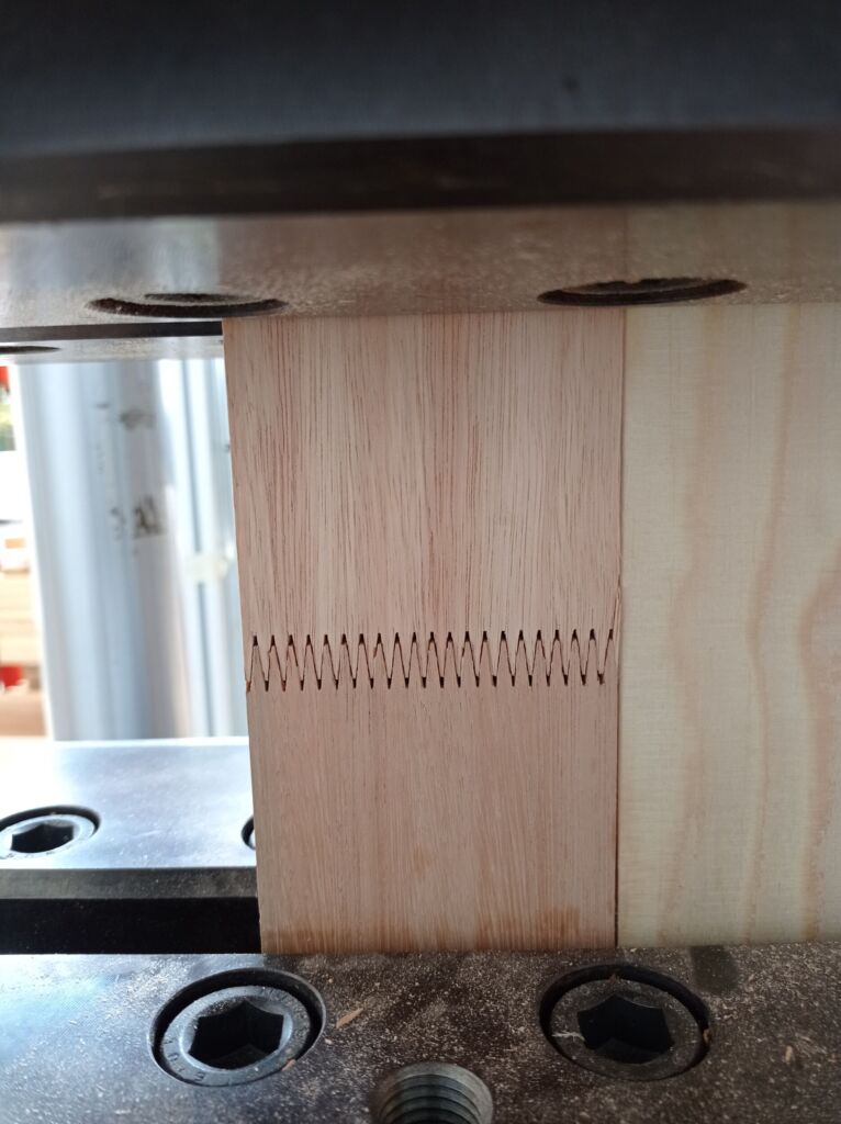Im Mittelpunkt steht die Weiterentwicklung der Keilzinkengeometrie sowie der Verklebungsparameter. Untersuchen wollen die Beteiligten neue, numerisch festigkeitsoptimierte Profilformen, die sie eigens auf die Eigenschaften von Laubhölzern abstimmen. Neben der werkzeugtechnischen Auslegung setzt das IfW hierzu auch die Herstellung der Verbindungen unter verschiedenen Bedingungen um, etwa Geometrie, Klebstoff, Auftragsmenge und Pressdruck. Zum Einsatz kommt dafür eine eigens ausgelegte Versuchspresse, mit der der Fertigungsprozess kontrolliert abbildbar ist. Ziel ist eine verbesserte Verbindung der Adhäsion sowie gute Bedingungen für eine belastbare Klebfuge.