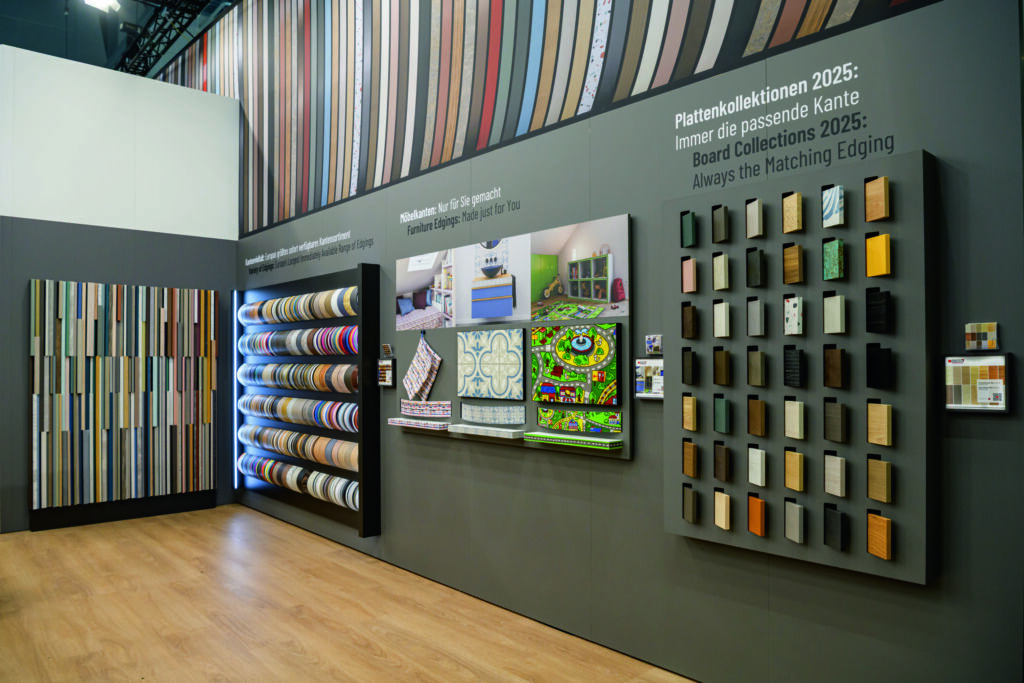 Ostermann stellte auf der Interzum auf 170m² abwechslungsreiche Raumwelten von der Küche bis zum Schlafzimmer vor. Herzstück: die aktuellen Kanten zu den neuen Kollektionen von Pfleiderer, Egger, Cleaf, Kronospan und Kaindl. Den Schwerpunkt bildeten extrem matte Oberflächen, die sich durch samtige Haptik und moderne Optik auszeichnen. Ebenfalls vielbeachtet waren die neuen Linoleumkanten. Ergänzend hinzu kam Oberflächenvielfalt von echtem Moos über Steinfurniere bis zu Designplatten von Sibu. Neben Möbelkanten zeigte Ostermann in Köln auch Neuheiten aus den Bereichen Klebstoffe, Reiniger, Möbelbeschläge, Korpuskonstruktion sowie Küchen- und Badezubehör.