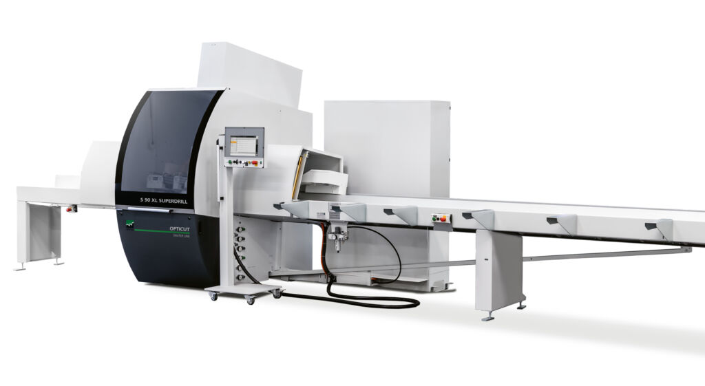 Premiere feiert die HS 200 mit integrierter Deltaroboter-Beschickung. Diese Komplettlösung übernimmt die schonende Zuführung von unsortierter Eingangsware zur Keilzinkanlage – gut für empfindliche Materialien. Mit dem intelligenten Spinfeed-System werden Teile automatisch nach Qualitätskriterien sortiert und ausgerichtet. Einen weiteren Schritt hin zur Prozessintegration geht die OptiCut S 90 Superdrill. Diese Kappanlage vereint Kappen, Bohren und Fräsen in einem Arbeitsgang. Der automatische Werkzeugwechsel treib die effiziente Bearbeitung voran.