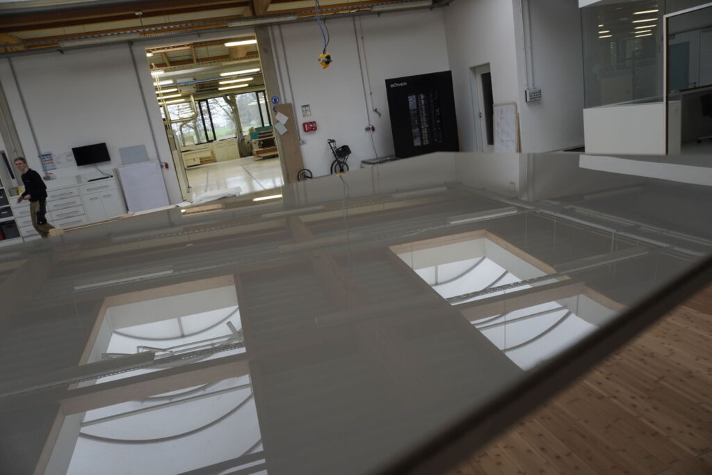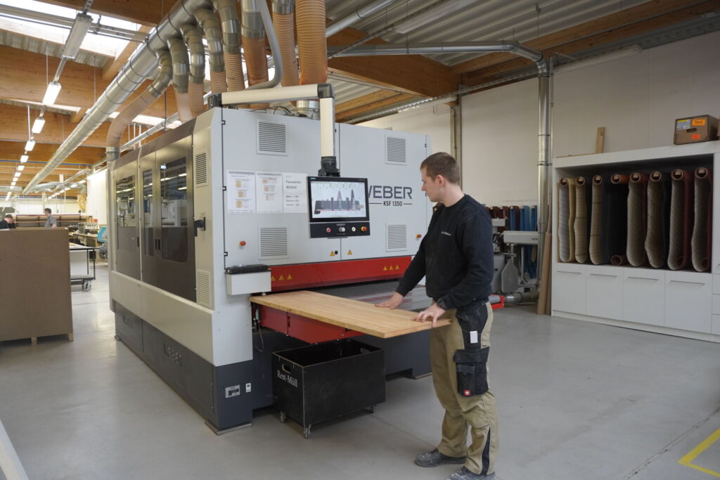 Böwer verbindet traditionelles Handwerk mit moderner Fertigung. Massenproduktion spielt hier keine Rolle – jedes Teil ist einzigartig. Deshalb setzt das Unternehmen auf zuverlässige Maschinen. Ein Beispiel ist die Schleifmaschine KSF-6-1350 von Weber. „Auf Weber sind wir über eine Empfehlung gestoßen“, sagt Hülsmann. „Wir waren rasch überzeugt: Die Maschine lässt sich bis ins Detail einstellen. Sie erkennt Ausschnitte und Unregelmäßigkeiten und kann bei Bedarf den Druck in einzelnen Bereichen anpassen.“ Die für Böwer gefertigte KSF-Maschine ist firmenspezifisch ausgestattet: mit besonderer Anordnung der Aggregate und Querbänder, mit Rundbürsten und Planetenköpfen.