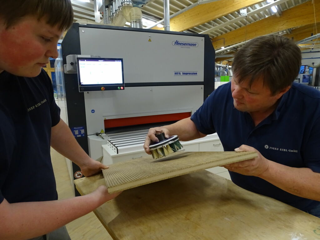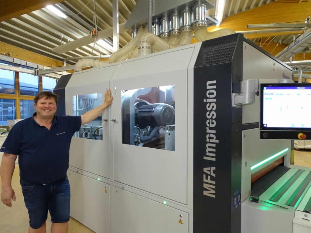 Seine neuste Errungenschaft: die MFA Impression. Die Vierbandmaschine ist ausgestattet mit einer Kontaktwalze, einem Querschleifaggregat, einem Längsschleifaggregat mit Drucklamellenband und dem Tellerbürstenaggregat DB-S. Neben Holz schleift der Allrounder auch Varicor. Überzeugt hat Eibl der Unterschied zu vergleichbaren Maschinen, vor allem im Druckbalkensystem CSD mit automatischer Druckanpassung über verschleißfreie Magnete. Denn das Verhältnis aus Abtastelementen zu Druckbalkensegmenten ist so hoch, dass selbst kleine Unterschiede im Einlaufbereich in die Berechnung des Drucks per Segment einfließen – Durchschleifen an der Werkstückkante ausgeschlossen.