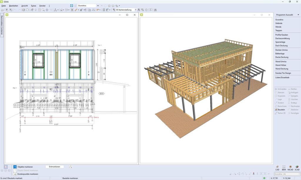 Um erfolgreich mit BIM zu planen und zu bauen, müssen im Holzbau drei Erfolgsfaktoren erfüllt sein: Erstens braucht es eine zentrale Datenhaltung, auf die alle Beteiligten zugreifen können. Zweitens ist der Einsatz von dynamischen Erweiterungen mit anpassbaren Stammdaten im generativen Design wichtig. Und drittens kommt es auf Zusammenarbeit in Echtzeit und die Dokumentation von Problemen und Verbesserungen an. Dabei kann der Holzbaubetrieb den Architekten in den BIM-Prozess einbinden, ohne dass er selbst mit BIM planen muss. Das gilt nicht nur für große Holzbaubetriebe, sondern auch für kleine Zimmereien, die z.B. nur einen Dachstuhl für ein Massivhaus fertigen. Denn die Sema-Lösung ist so mit der Produktionsautomatik verknüpft, dass komplette Tragwerke automatisch abgebunden und gefertigt werden können – inklusive Dämmung und Fassadenaufbau. Sobald das Gebäude konstruiert ist, erstellt die Software die Material- und Maschinenliste automatisch, parametrisiert die Bearbeitungswege und bereitet die Daten maschinengerecht auf.