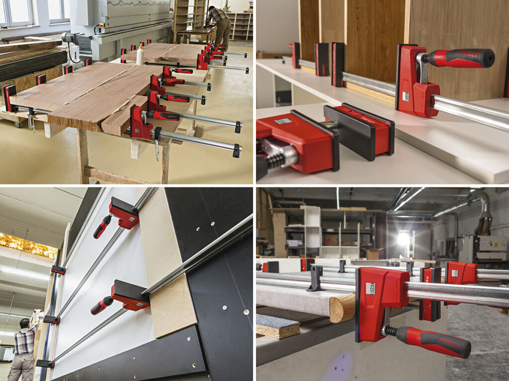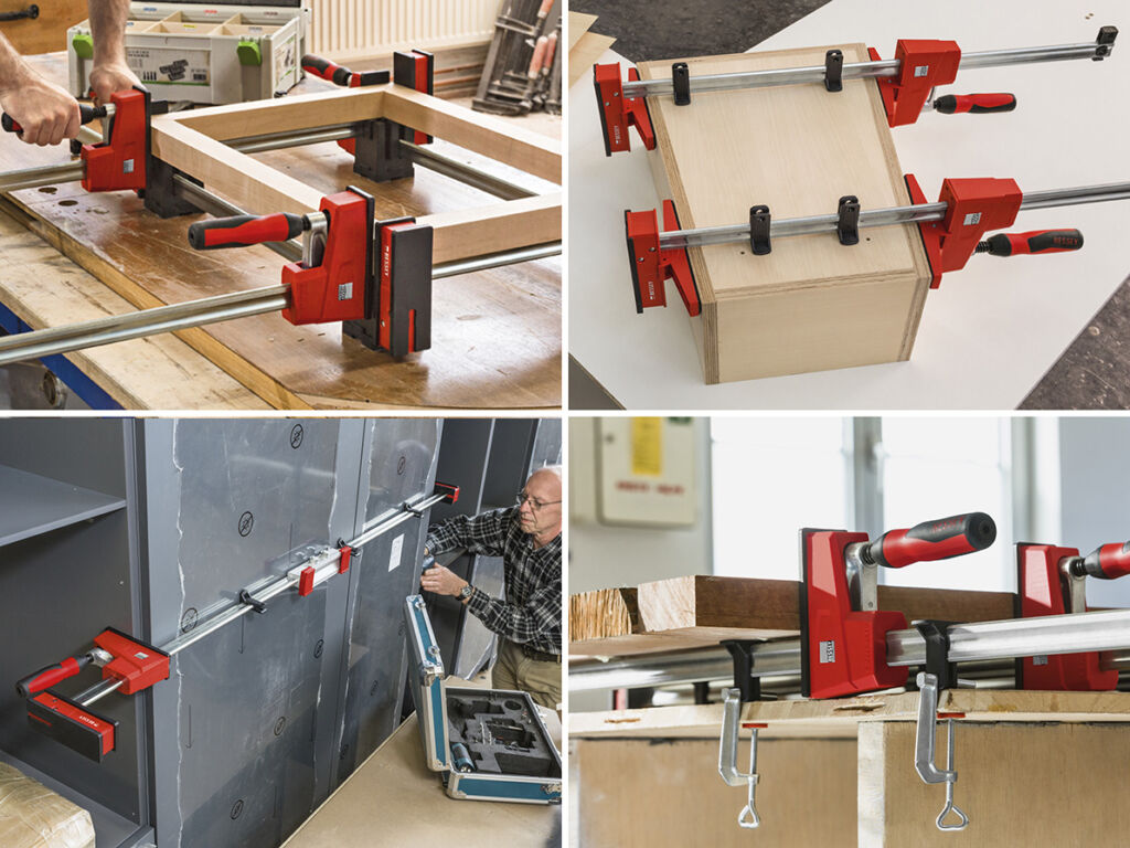 Die Korpuszwingen KRE und KREV sind Teil eines Spannkonzepts, das mit umfangreichem Zubehörsortiment zusätzliche Einsatzgebiete erschließt. Beispielsweise sind mit der Verlängerung KBX zwei Zwingen miteinander verbindbar, um die Spannweite auf bis zu 5m zu vergrößern. Um außerhalb rechter Winkel zu spannen, ist der Schwenkadapter KR-AS erhältlich. Er lässt sich auf die Spannbacken aufschieben und ist in einem Schwenkbereich von 30° stufenlos verstellbar. Auch um Rahmen zu spannen, bietet Revo ein Extra: das variable Rahmenpressen-Set KP. Es besteht aus vier Winkeln mit jeweils 90°. Mit ihnen lässt sich der Spanndruck mit zwei eingelegten Zwingen pro Ecke separat einstellen. Und dank der Tischklemmen TK6 können Anwender die Zwingen mit Werkstückauflagen ohne viel Aufwand an einer Werkbank sicher befestigen.